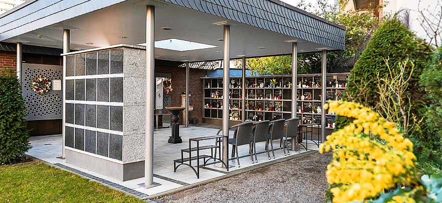 Unsere Urnenkammern mit Platz für jeweils bis zu zwei Urnen sind stilvoll und aus hochwertigen Materialien, drinnen im angenehm klimatisierten Raum, draußen überdacht. Der Zugang ist barrierefrei, Sitzgelegenheiten, die zum Verweilen und Andacht halten einladen, stehen bereit und selbstverständlich ist es möglich auch einzelne persönliche Andenken oder Blumenschmuck an der Urnenkammer zu platzieren. So können Sie die Ruhestätte dezent individuell gestalten, ohne großen Pflegeaufwand betreiben zu müssen. Die Ruhezeit jeder Urne beträgt 12 Jahre, kann aber darüber hinaus verlängert werden. |